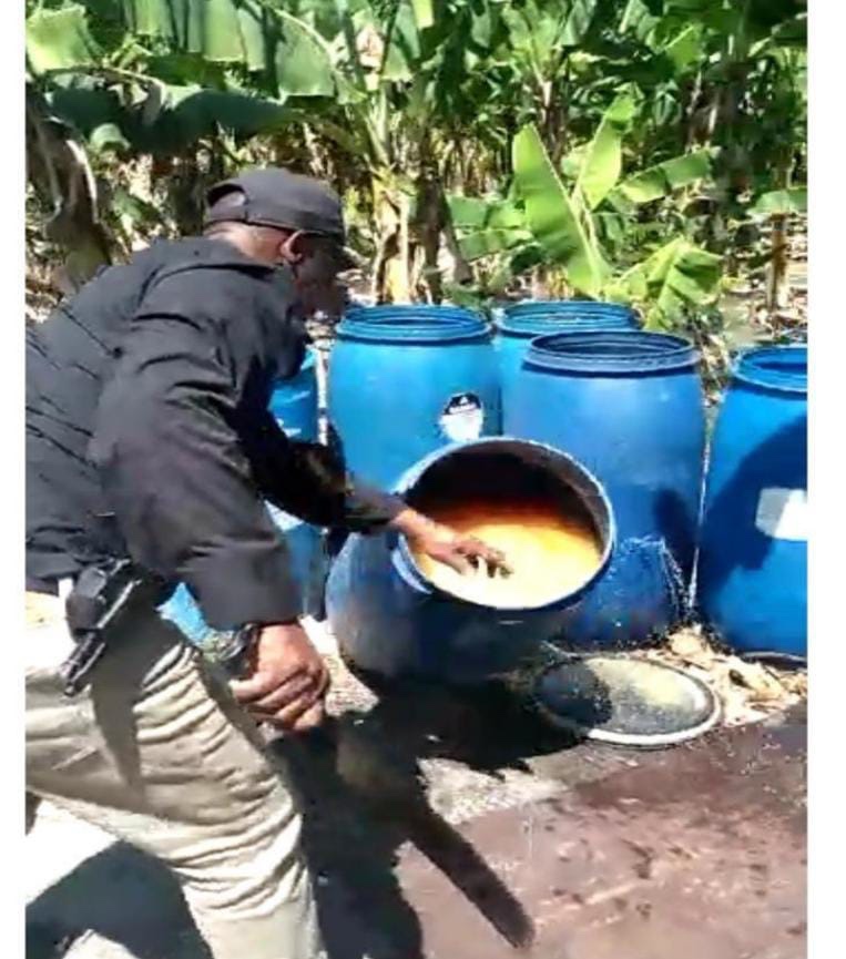 BAHORUCO.- El Cuerpo Especializado de Control de Combustibles y Comercio de Mercancías CECCOM decomisó en el municipio de Villa Jaragua, provincia Bahoruco, 13 tanques con triculí para la fabricación de alcohol artesanal.