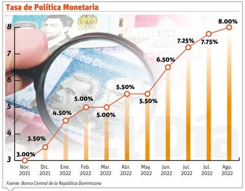 En la reunión de agosto de este año el BCRD decidió aumentar su tasa de interés de política monetaria en 25 puntos básicos, de 7.75 % a 8.00 % anual.