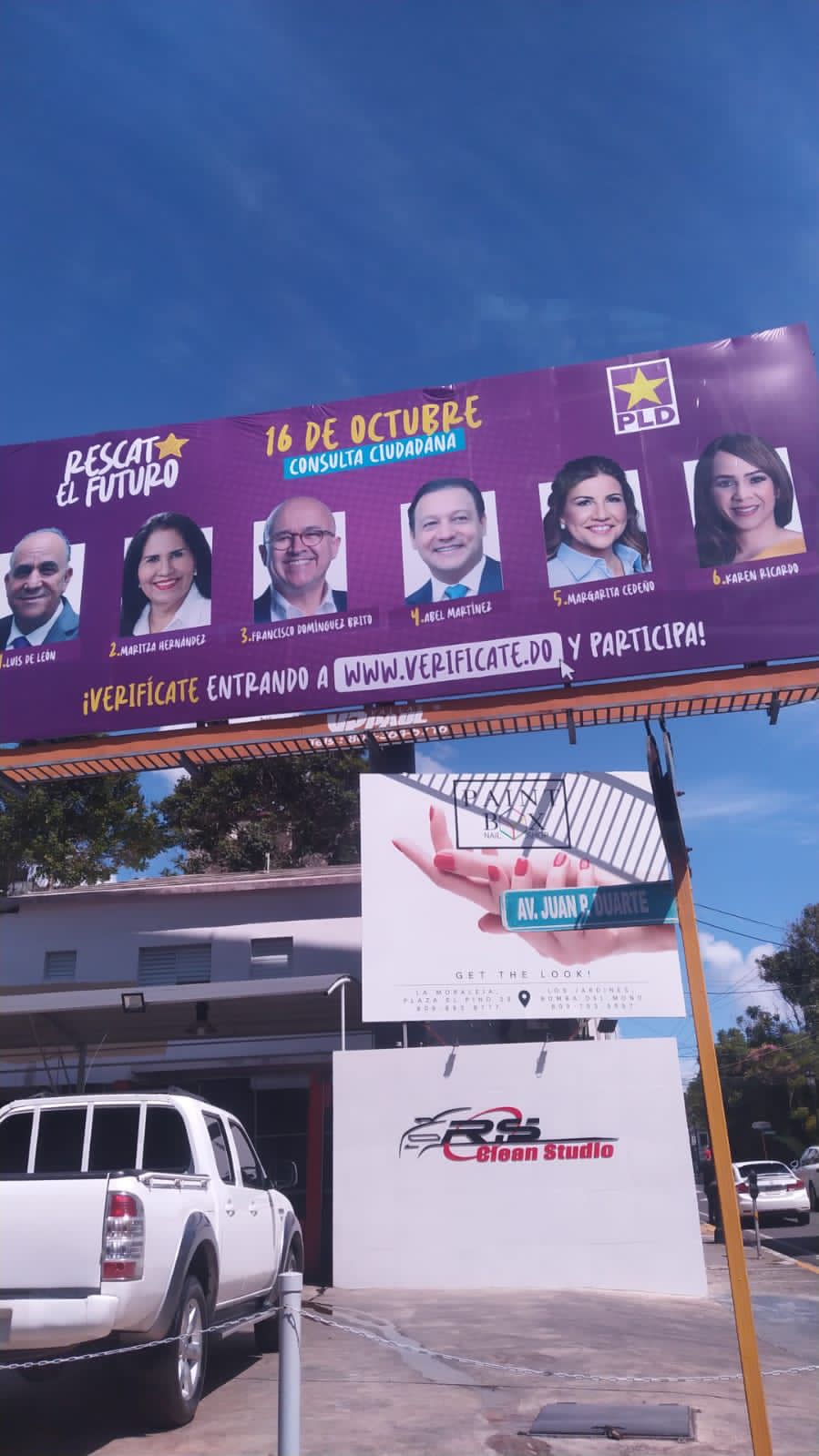 La propaganda en la que llama a los inscritos en la organización morada a verificarse, está ubicada en la calle Del Sol, esquina con Juan Pablo Duarte frente a las oficinas de la Dirección General de Aduanas.