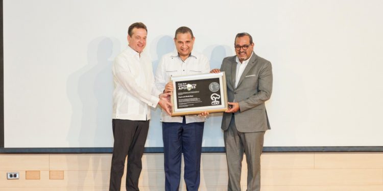 El empresario Francisco Morilla recibe reconocimiento del ministro de Industria y Comercio Víctor Ito Bisonó, Juan Ventura presidente de Airen. Le acompañan los empresarios Alba Luz Diaz y Paulo Paiewonsky