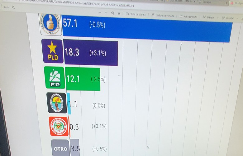 Domingo.- Si las elecciones presidenciales fueran hoy un 57.1% votaría por el Partido Revolucionario Moderno (PRM), un 18.3% por el Partido de la Liberación Dominicana (PLD) y un 12.1% lo haría por el partido Fuerza del Pueblo (FP), conforme a los resultados presentados por la firma encuestadora RD Elige del grupo RCC Media, en alianza con México Elige.