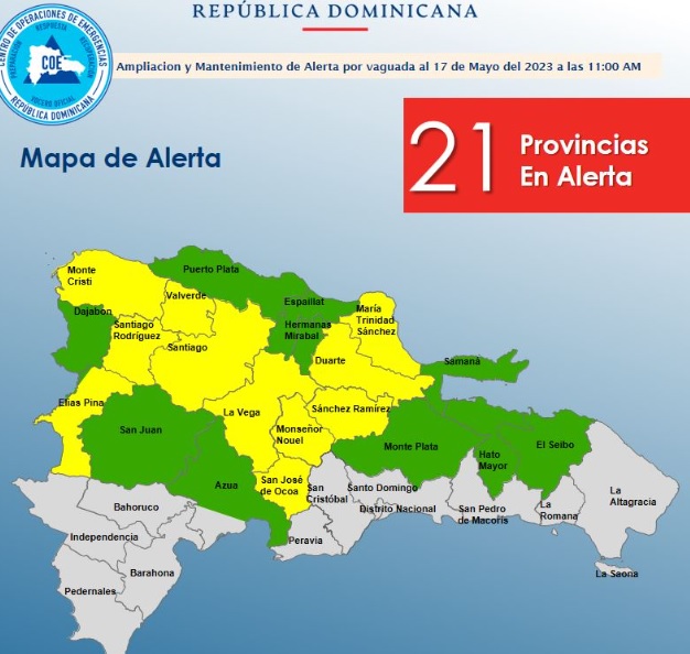Mientras que en alerta amarilla están: Montecristi, Santiago, La Vega, San José de Ocoa, Monseñor Nouel, Sánchez Ramírez, Santiago Rodríguez, María Trinidad Sánchez, Duarte, Valverde y Elias Piña.