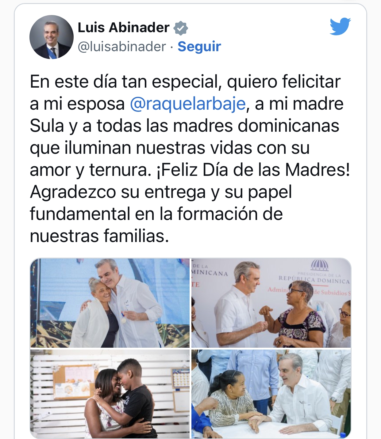“En este día tan especial, quiero felicitar a mi esposa @raquelarbaje, a mi madre Sula y a todas las madres dominicanas que iluminan nuestras vidas con su amor y ternura. ¡Feliz Día de las Madres! Agradezco su entrega y su papel fundamental en la formación de nuestras familias”, señaló el mandatario.