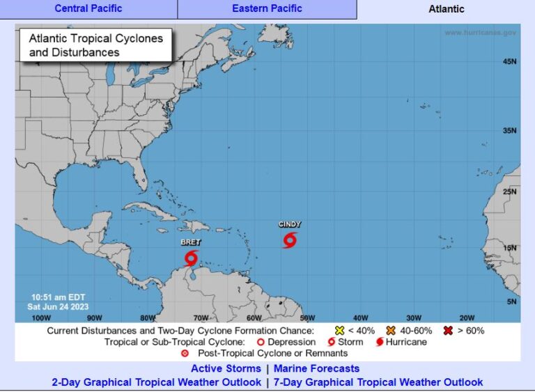 La Oficina Nacional de Meteorología (ONAMET) informa que la tormenta tropical CINDY, se localiza a unos 1,090 kilómetros al este de las Antillas Menores. Sus vientos máximos sostenidos son de 95 km/h con ráfagas superiores, se mueve hacia el oeste/noroeste a unos 24 km/h.