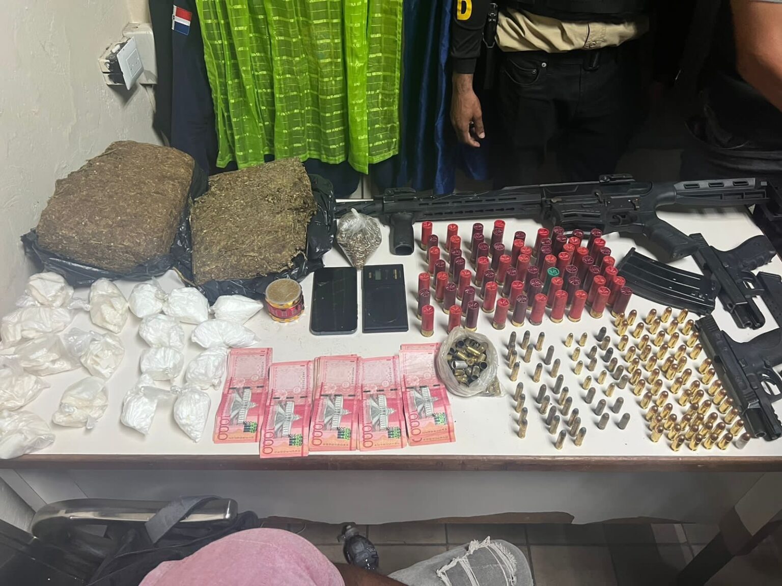 Miembros de la Dirección Regional San Cristóbal de la Policía en colaboración con el Ministerio Público allanaron una vivienda donde incautaron varias armas de fuego, 20 porciones de drogas variadas.