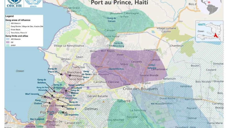 Según el informe, las bandas 400 Mawozo, G9, Kraze Barye, Gang Ravine, Village de Dieu, Krache Dife, Terre Noire, Pierre VI y GPEP dominan gran parte de la periferia haitiana. Mientras tanto, el gobierno y la Policía Nacional de Haití controlan el centro de la capital y el aeropuerto.