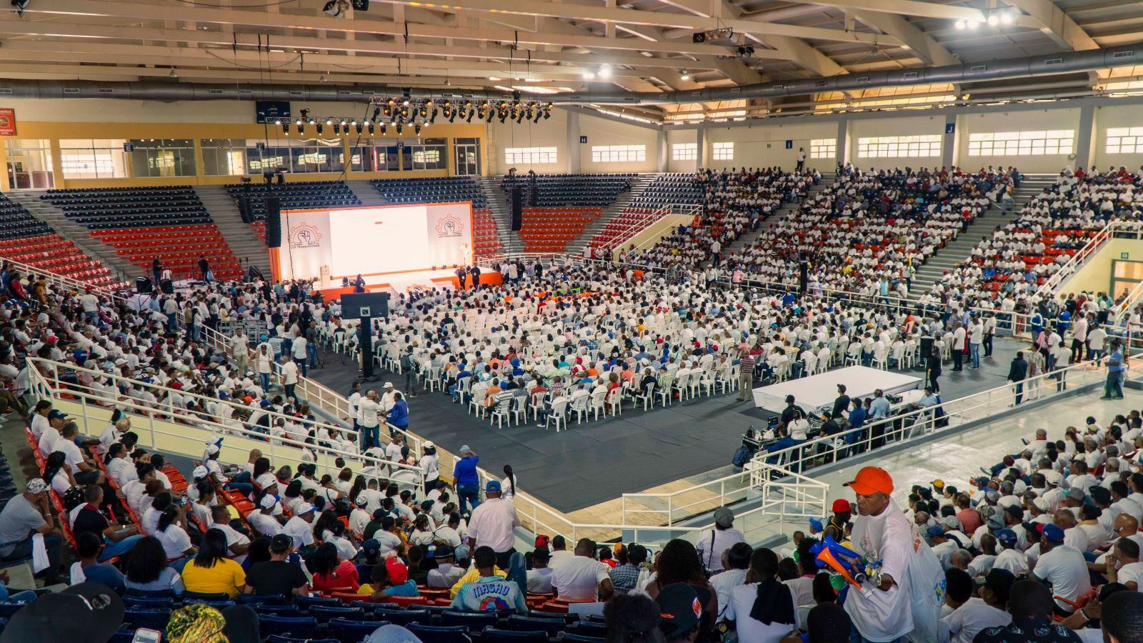 Los líderes trabajadores Gabriel del Río, Jacobo Ramos y Pepe Abreu lanzaron el movimiento “Trabajadores con Luis” en una actividad masiva en el Pabellón de Voleibol del Centro Olímpico Juan Pablo Duarte.
