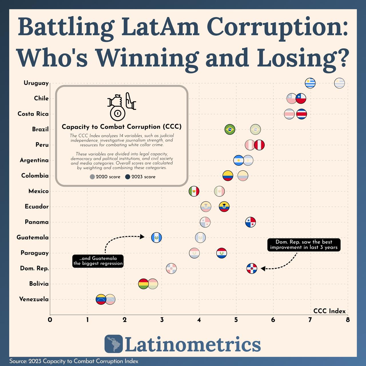 La infografía de Latinometrics complementa el Índice CCC 2023, ofreciendo una visualización clara y concisa de los datos y tendencias en la región, resaltando que dentro del contexto latinoamericano, ha sido el país con más avances en su lucha contra la corrupción.