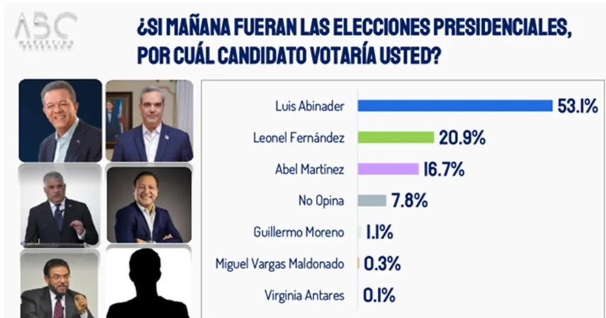A los entrevistados se les preguntó que si mañana fueran las elecciones presidenciales por cuál candidato votarían y el 53.1% dijo que por Luis Abinader; el 20.9% por Leonel Fernández; un 16.7% por Abel Martínez; un 1.1% por Guillermo Moreno; el 0.3% por Miguel Vargas y el 7.8% no opinó.
