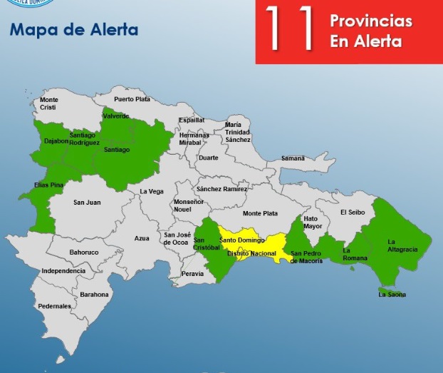 Las provincias en alerta amarilla son: Distrito Nacional y Santo Domingo. Mientras que en alerta verde se encuentran: La Romana, Dajabón, Santiago, San Pedro de Macorís, Valverde, Elías Piña, La Altagracia, Santiago Rodríguez y San Cristóbal.