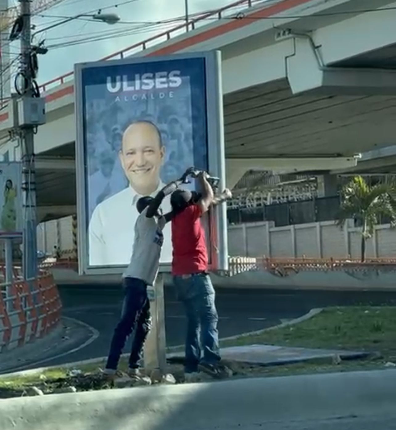 Santiago-Circula en redes sociales imágenes de tres personas que fueron sorprendidas destruyendo la publicidad del candidato a alcalde por el municipio de Santiago, Ulises Rodríguez, la acción llamó la atención de ciudadanos que al notar que se cometía un abuso, empezaron a grabar y cuestionaron a los sujetos, dos haitianos y un dominicano quienes se negaron a identificarse.