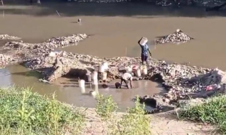 Dajabón. Grupos de haitianos con cubetas, palas, sacos camiones y vigilados por civiles con armas largas excavan agregados del río Masacre, a corta distancia del lugar en conflicto por la construcción de un canal que desviará su curso.