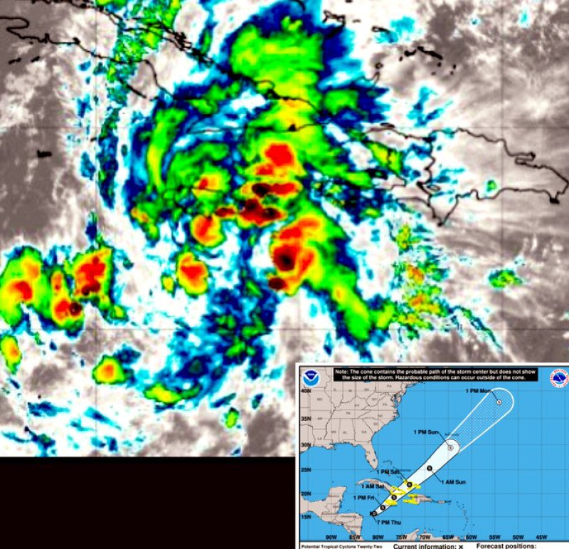 El potencial ciclón tropical se ha ubicado a unos 415 kilómetros al oeste/suroeste de Kingston, Jamaica, con vientos máximos sostenidos de hasta 55 kph y se desplaza hacia el noreste a una velocidad de 17 kph.