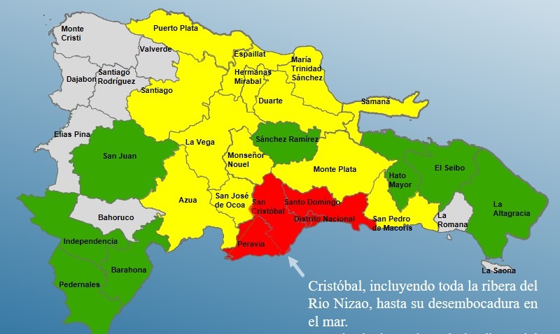 El director del COE, Juan Manuel Méndez, informó en rueda de prensa de que en alerta roja están San Cristóbal, incluyendo toda la Ribera del río Nizao hasta su desembocadura en el mar Caribe, al igual que Perabia, así como el Distrito Nacional y la provincia de Santo Domingo.