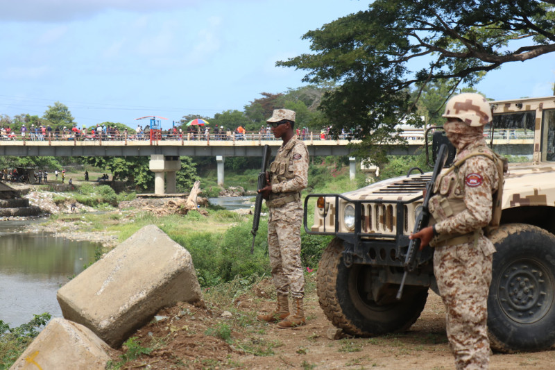 Después de las manifestaciones violentas escenificadas en la comundad haitiana Juana Méndez, militares adscritos del Cuerpo Especializado en Seguridad Fronteriza Terrestre(Cesfront) vigilan los alrededores y la entrada a territorio dominicano de cientos de haitianos que buscan participar en el mercado fronterizo de Dajabón.