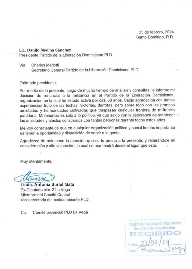 Suriel quien también fue precandidata a alcaldesa por el PLD en el municipio de Jarabacoa, mediante una carta dirigida al presidente del partido, Danilo Medida y vía el secretario general Charles Mariotti, detalló que tras mucho tiempo de análisis y consultas tomó la decisión de renunciar a su militancia política en ese partido, del que también era vicesecretaria de Medios del CC.