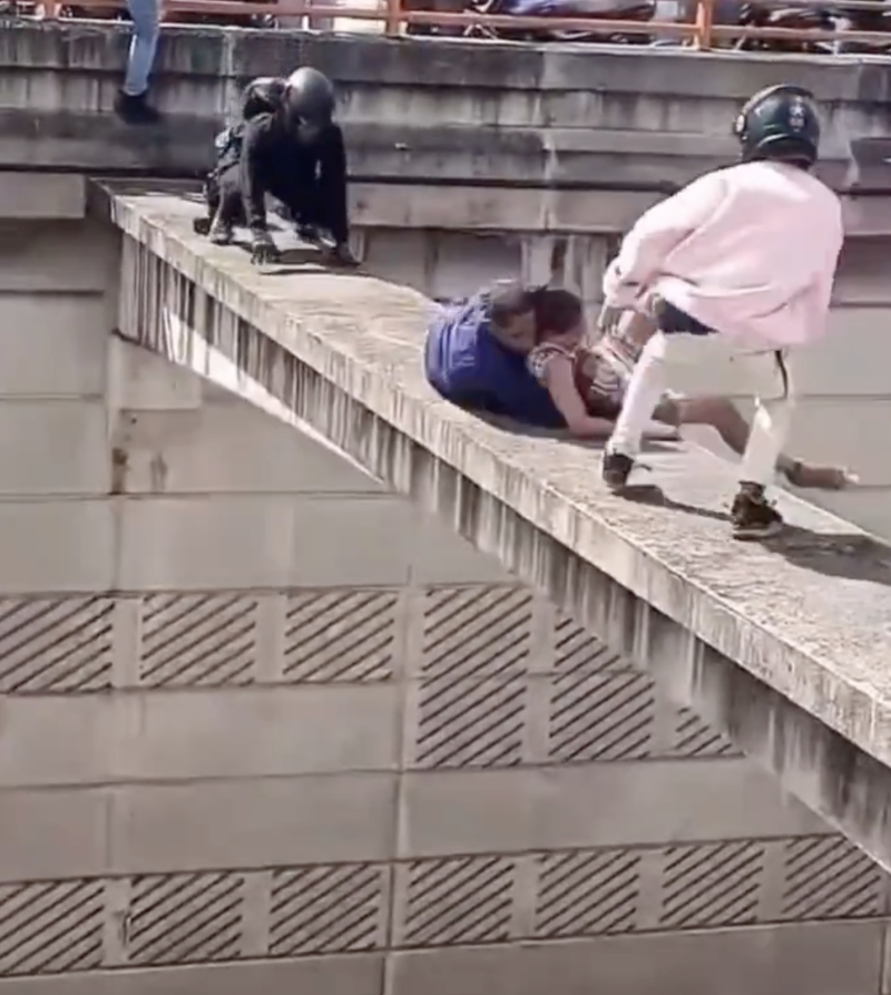 Con un pantalón blanco y una camisa azul, en un extremo del muro se lanzó el primer valiente sobre la chica, quien se resistía. En seguida se sumó otro en el extremo contrario, con su casco de motorista. Y así se agregaron dos más para sujetarlos y que no cayeran también. Otros motoristas les gritaban que hacer para evitar una tragedia.