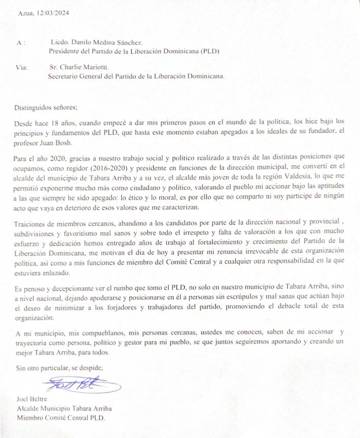 SANTIAGO.– Renunció del Partido de la Liberación Dominicana (PLD), el actual alcalde del municipio Tábara Arriba, en la provincia de Azua, Joel Beltre, luego de 18 años de militancia en esa organización política.