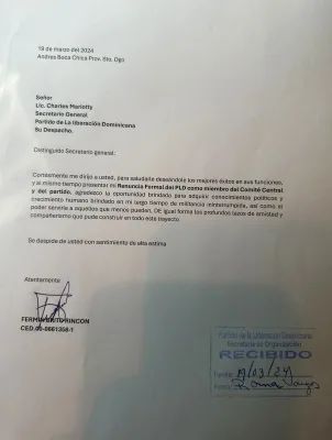 En una misiva dirigida a Danilo Medina Sánchez, y Charles Mariotti, presidente y secretario general del PLD, respectivamente, agradeció la oportunidad brindada en esa organización política para adquirir conocimientos políticos y el crecimiento humano brindado a lo largo de su militancia ininterrumpida.