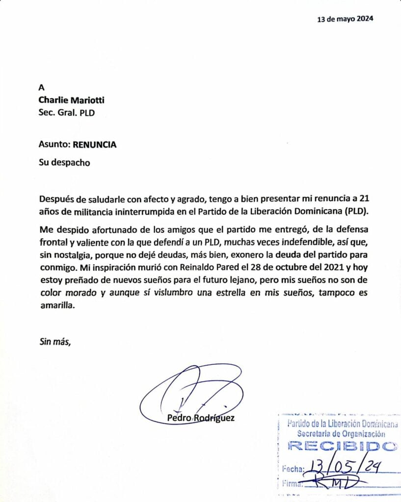 De su lado, Pedro quién también fue asistente del alcalde Rodolfo Valera en 2010, fue más lejos: «Me despido afortunado de los amigos que el partido me entregó, de la defensa frontal y valiente con la que defendí a un PLD, muchas veces indefendible, así que,sin nostalgia, porque no dejé deudas, más bien, exonero la deuda del partido para conmigo».