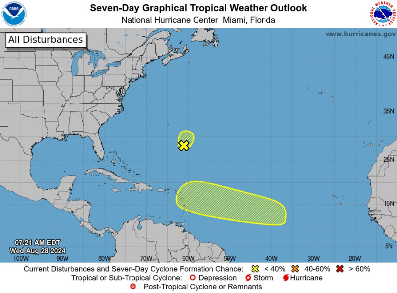 El Instituto Dominicano de Meteorología (Indomet) informó que mantienen la vigilancia de dos fenómenos atmosféricos que podrían convertirse en ciclón tropical, el primero, una zona de aguaceros con tormentas eléctricas asociada a un área de baja presión, con un 20% de probabilidad de formarse en la porción central del Atlántico durante los próximos 7 días.