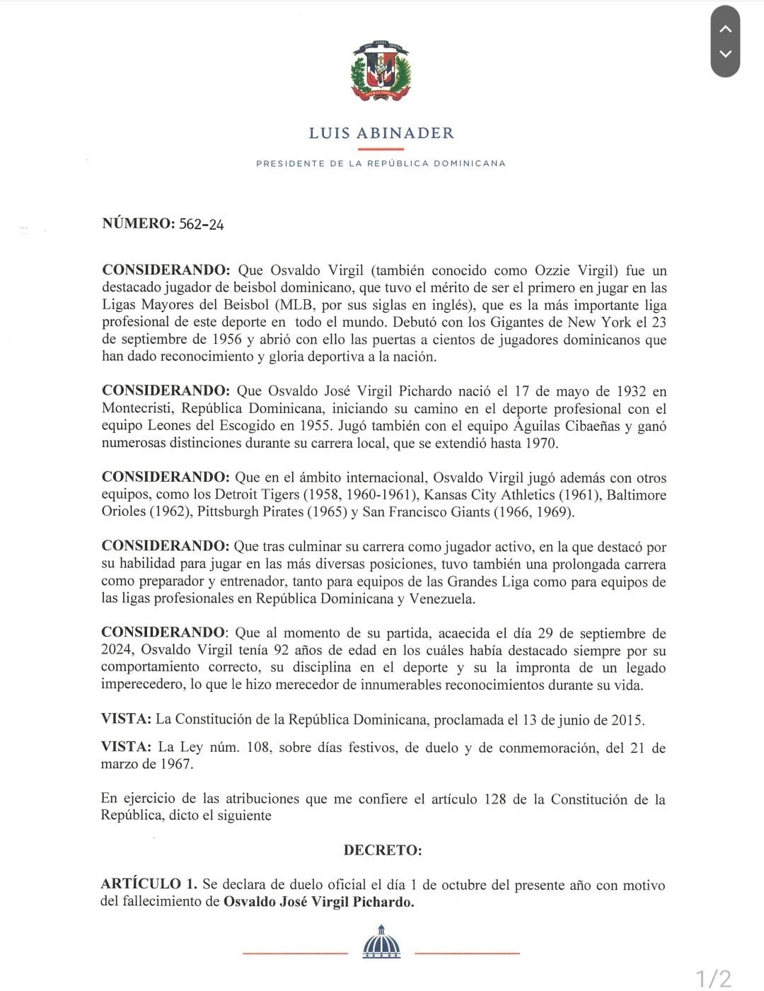 Mediante el decreto número 562-24, de fecha de hoy, el presidente Luis Abinader declaró día de duelo oficial el martes 1 de octubre del presente año con motivo del fallecimiento de Osvaldo José Virgil Pichardo. En consecuencia, y como es de rigor, se instruyó al Ministerio de Defensa a que rinda los honores militares a este prominente ciudadano dominicano y se dispuso que la Bandera Nacional deberá ondear a media asta el día señalado en los recintos militares y edificios públicos en todo el país.