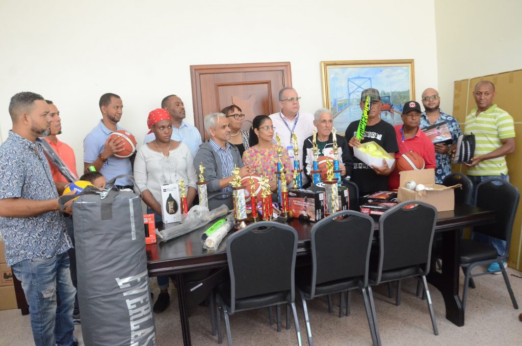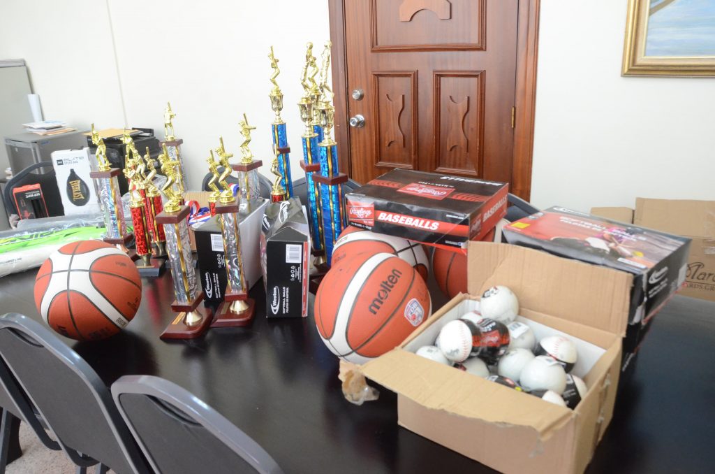 Entre los artículos entregados se incluyen copas, trofeos, medallas, balones de baloncesto, voleibol, fútbol y béisbol, así como mallas de voleibol, bates de béisbol y softbol, aros, guantes y otros accesorios.