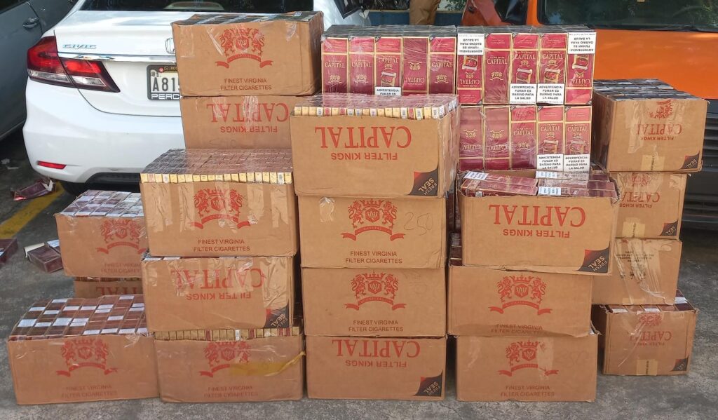 Durante el operativo, realizado frente a su residencia, en el sector Brisas del Este, las autoridades incautaron 60 cajas que contenían un total de 8,069 cajetillas de cigarrillos, lo que equivale a 161,380 unidades.