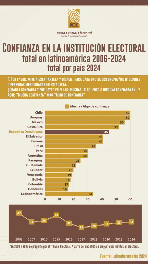 SANTO DOMINGO. – El informe de Latinobarómetro 2006-2024 sitúa a la Junta Central Electoral (JCE) de República Dominicana, como la quinta institución electoral de la región en donde hay más confianza y la sexta entre los que piensan que las elecciones son limpias.