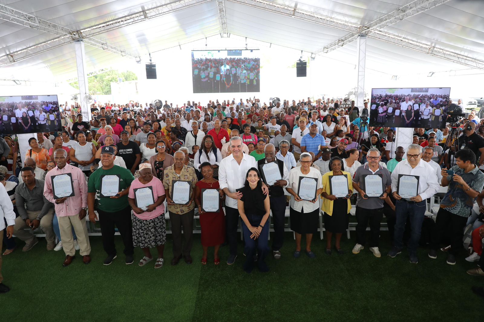 Santo Domingo Oeste.- El presidente Luis Abinader junto a la primera dama Raquel Arbaje entregó este domingo en el Batey Palavé 708 títulos de propiedad que beneficiarán a 2,832 personas, lo que representa estabilidad, paz y seguridad jurídica para los beneficiarios.