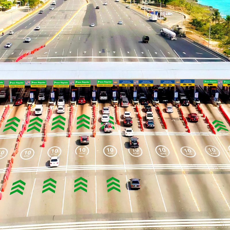 El peaje Juan Bosch cuenta con cuatro carriles para vehículos livianos, cuatro para vehículos pesados y cuatro carriles exclusivos para paso rápido.