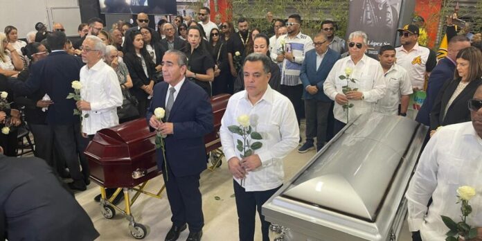 Santiago.- El presidente de Las Águilas, Víctor Sued encabezó este miércoles junto a una delegación de la directiva y peloteros del equipo amarillo una guardia de honor ante los restos de los cronistas deportivos, Mendy López y Juan José Tejada, en el Estadio Cibao.