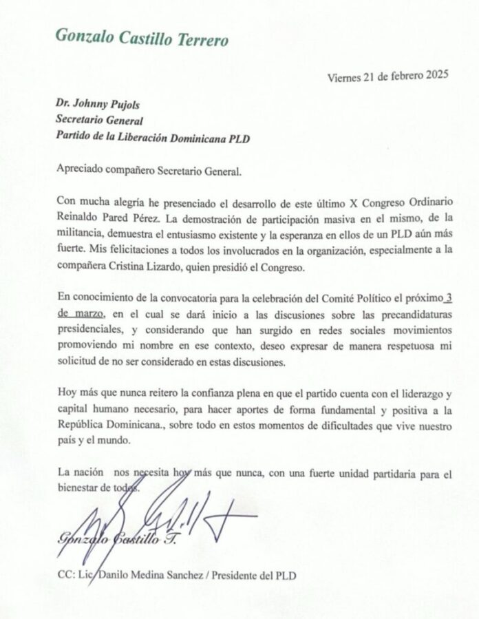 «En conocimiento de la convocatoria para la celebración del Comité Político el próximo 3 de marzo, en el cual se dará inicio a las discusiones sobre las precandidaturas presidenciales, y considerando que han surgido en redes sociales movimientos promoviendo mi nombre en ese contexto, deseo expresar de manera respetuosa mi solicitud de no ser considerado en estas discusiones», escribió Castillo.
