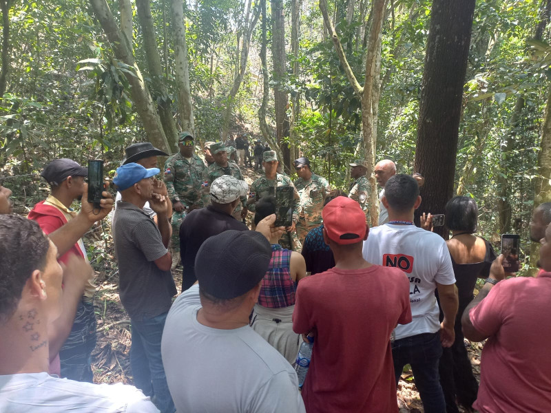 Decenas de militares mantienen cercada la loma de Zambrana, avanzando montaña adentro, donde los comunitarios han instalado un campamento permanente para vigilar y evitar que la Barrick Gold corte los árboles y destruya la cabecera del río El Naranjo, única fuente de agua para más de seis comunidades de esta localidad del municipio de Cotuí.