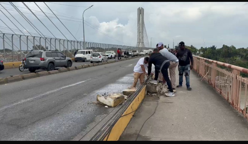Pasadas las 3:30 de la tarde este sábado, se observó la reposición de uno de los postes y la instalación de otro por una brigada de aproximadamente siete hombres, así como una guagua rotulada bajo la empresa contratista “Pinsa”, encargada de mantenimiento y reparación del puente.