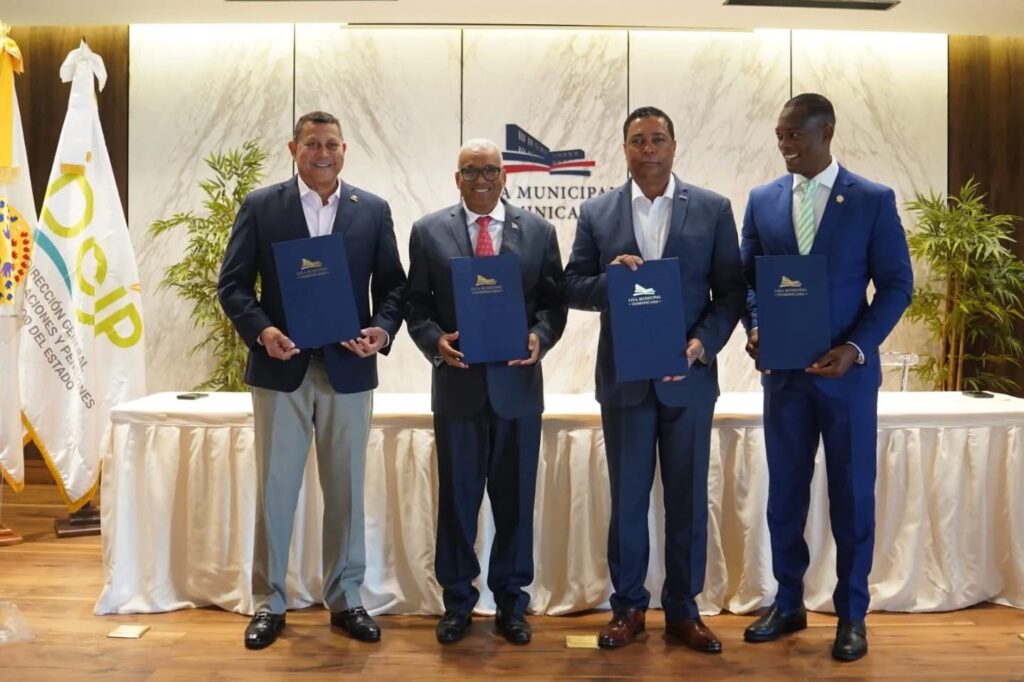 El acuerdo fue suscrito por Nelson Núñez, presidente de Fedomu y alcalde de Samaná; Juan Rosa, director de Jubilaciones y Pensiones; Víctor D’ Aza, presidente de la LMD; y Leoncito José, presidente de Fedodim.