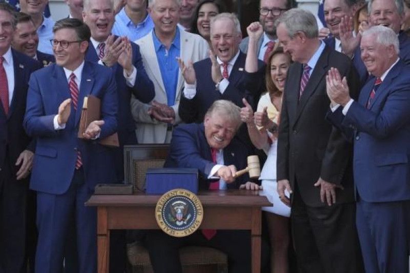 Flanqueado por legisladores republicanos y miembros de su gabinete, Trump firmó la legislación multimillonaria fuera de la Casa Blanca, y luego golpeó el mazo que le regaló el presidente de la Cámara de Representantes, Mike Johnson, y que se utilizó durante la aprobación final del proyecto de ley el jueves.
