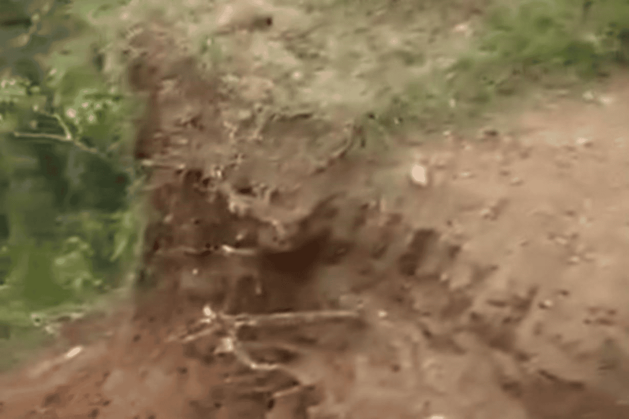 En las imágenes se muestra a agentes policiales reparando de forma provisional el agujero con piedras y arena para poder cruzar hacia el lado donde se encuentran los bandidos.