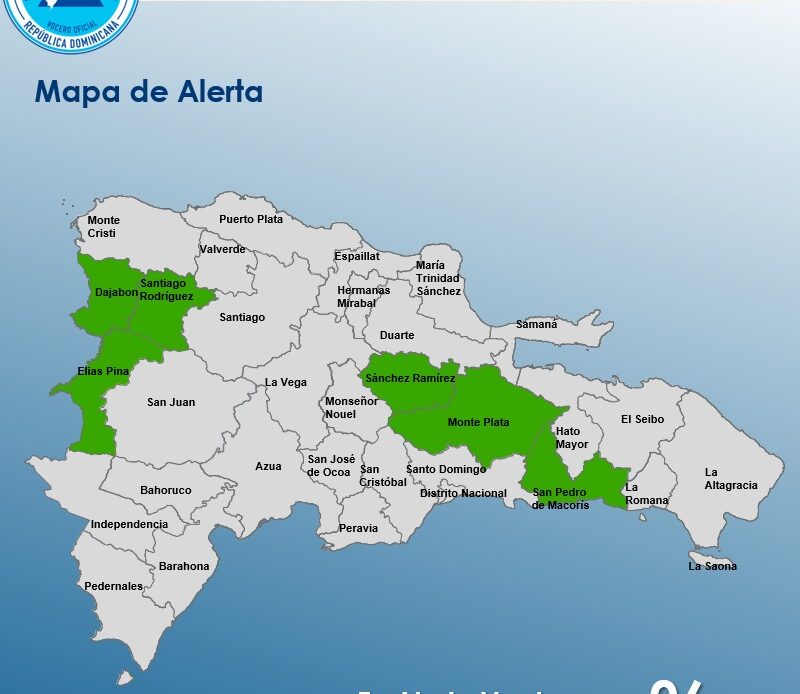 En consecuencia el COE mantiene el nivel de alerta verde para las provincias Sánchez Ramírez, Santiago Rodríguez, San Pedro de Macorís, Dajabón, Monte Plata y Elías Piña, ante la posibilidad de crecidas de ríos, arroyos y cañadas, así como inundaciones repentinas o urbanas.