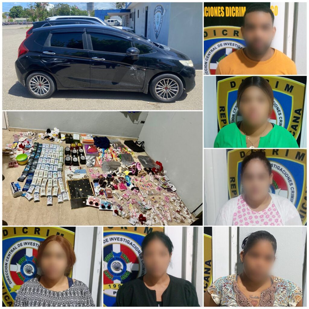 Santiago de los Caballeros, R.D. – La Subdirección Regional de Investigación Criminal (DICRIM) de la Policía Nacional en Santiago informa sobre el arresto de seis personas frente al Hospital HOMS, a bordo del vehículo marca Honda Fit, color negro, en circunstancias que los vinculan con el presunto robo de mercancías de establecimientos comerciales de esta ciudad.
