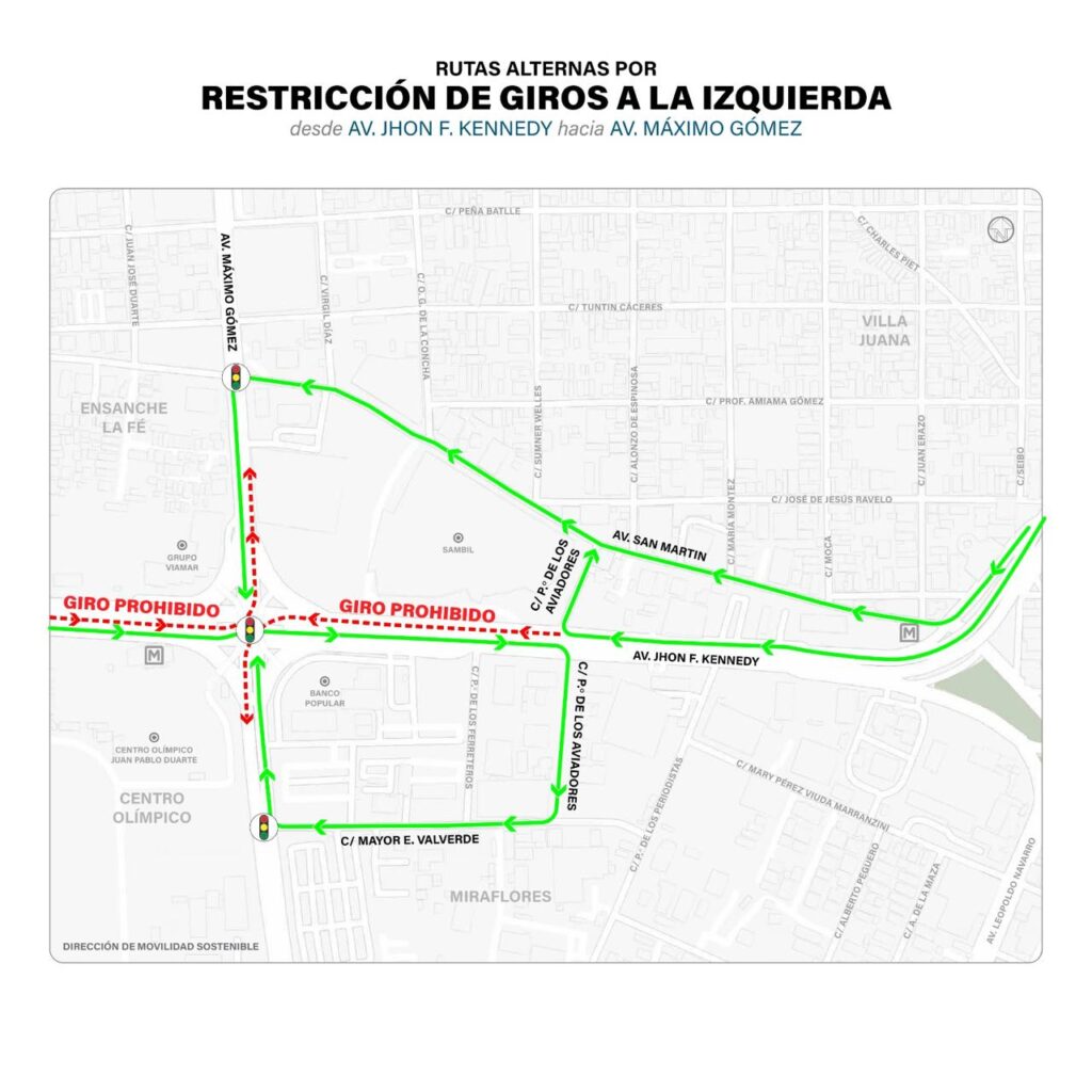 Para el giro restringido en la John F. Kennedy hacia el sur por la Máximo Gómez, los conductores podrán tomar la avenida San Martín y girar a la izquierda en la avenida Máximo Gómez, o bien utilizar la calle Paseo de los Aviadores para incorporarse a San Martín y desde allí conectar con Máximo Gómez hacia el sur.