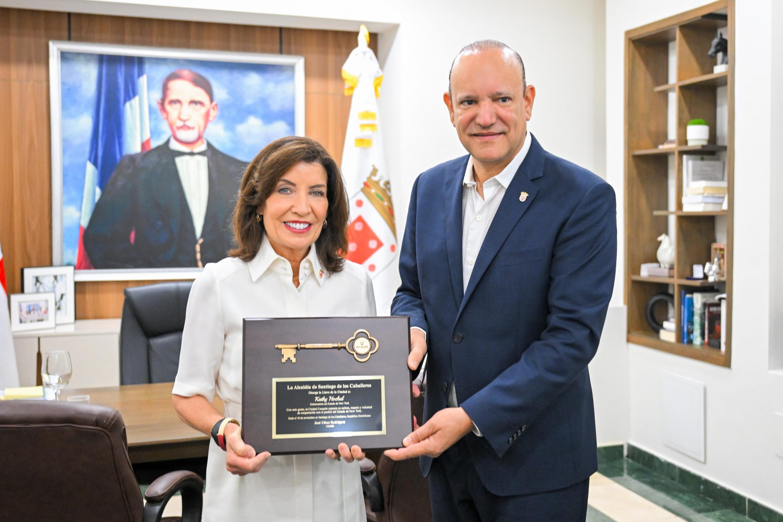 Santiago de los Caballeros,– El Concejo de Regidores del Ayuntamiento de Santiago de los Caballeros reconoció como “Visitante de Honor” a la gobernadora del estado de Nueva York, Kathy Hochul, otorgándole además la llave de la ciudad. En el mismo escenario, el órgano edilicio declaró como “Hijo Distinguido” al congresista dominicano-estadounidense Adriano Espaillat, en reconocimiento a su trayectoria pública y sus aportes a la diáspora dominicana.