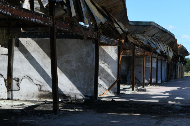 Seis meses después de un incendio, toda la estructura continúa destruida y abandonada tras el destrozo, con sus deformaciones y fisuras visibles, columnas desprendidas, suelo cubierto de escombros y techo desprendido.