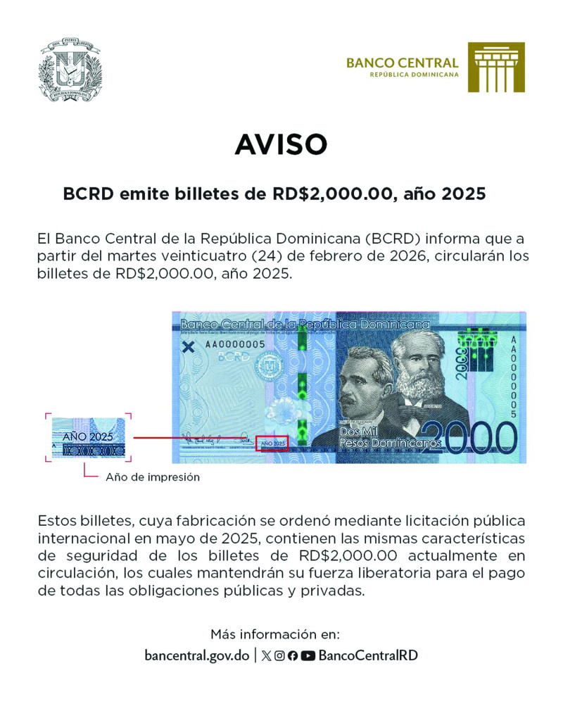 El Banco Central de la República Dominicana (BCRD) informó que a partir del martes veinticuatro (24) de febrero de este año circularán los billetes de RD$2,000.00, año 2025.