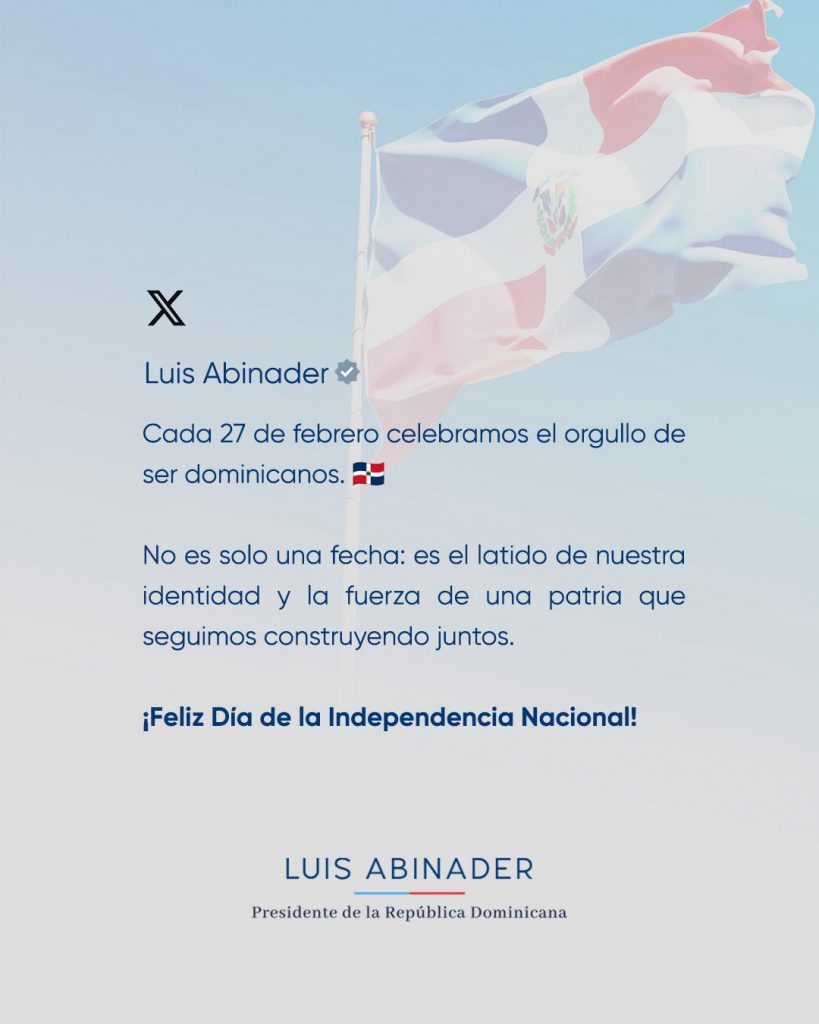 “Cada 27 de febrero celebramos el orgullo de ser dominicanos. No es solo una fecha: es el latido de nuestra identidad y la fuerza de una patria que seguimos construyendo juntos. ¡Feliz Día de la Independencia Nacional!”.