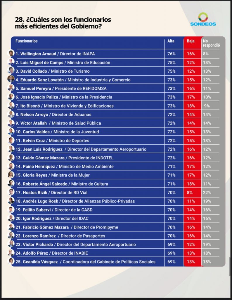 Le sigue el ministro de Educación, Luis Miguel de Camps, quien obtiene 75% de valoración positiva y solo 12% negativa. Igual valoración alcanza el ministro de Turismo, David Collado (+75% y -12%). Eduardo Sanz Lovatón, ministro de Industria y Comercio logra (+73 y -15%); Samuel Pereyra, Presidente de REFIDOMSA (+73% y -16%); José Ignacio Paliza, ministro de la Presidencia (+73% y -17%).